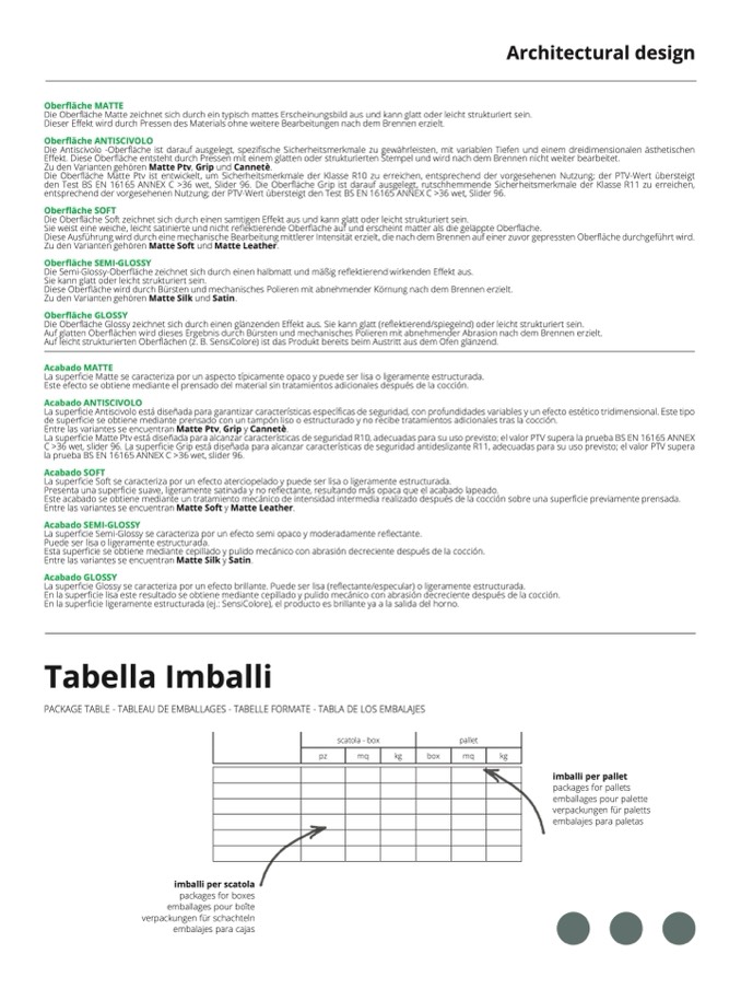 La superficie Antiscivolo está diseñada para garantizar características específicas de seguridad, con profundidades variables y un efecto estético tridimensional. Este tip