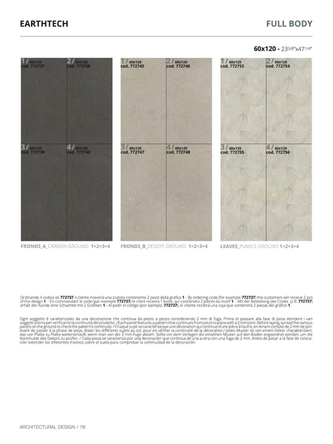 ficarne la continuità del prodotto. / Each panel features a pattern that continues from piece to piece with a 2 mm joint. Before laying, spread the variou