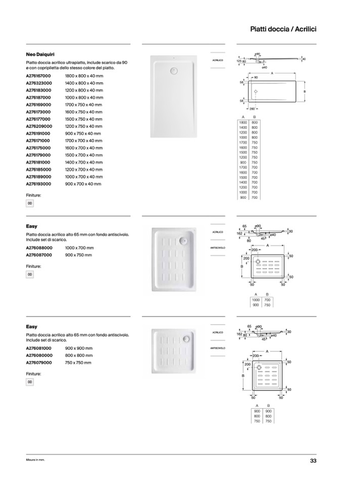 Piatto doccia acrilico alto 65 mm con fondo antiscivolo.