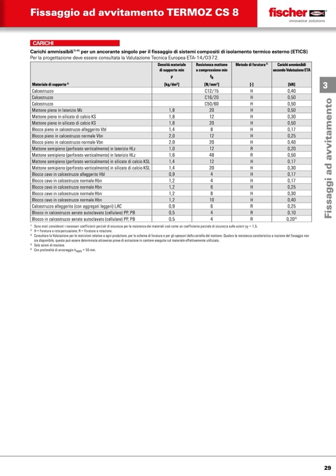 Consultare la Valutazione per le restrizioni relative a ogni produttore, per lo schema di foratura e per gli spessori della cartella del mattone. Qualora la resistenza caratteristica a trazione del fissaggio non