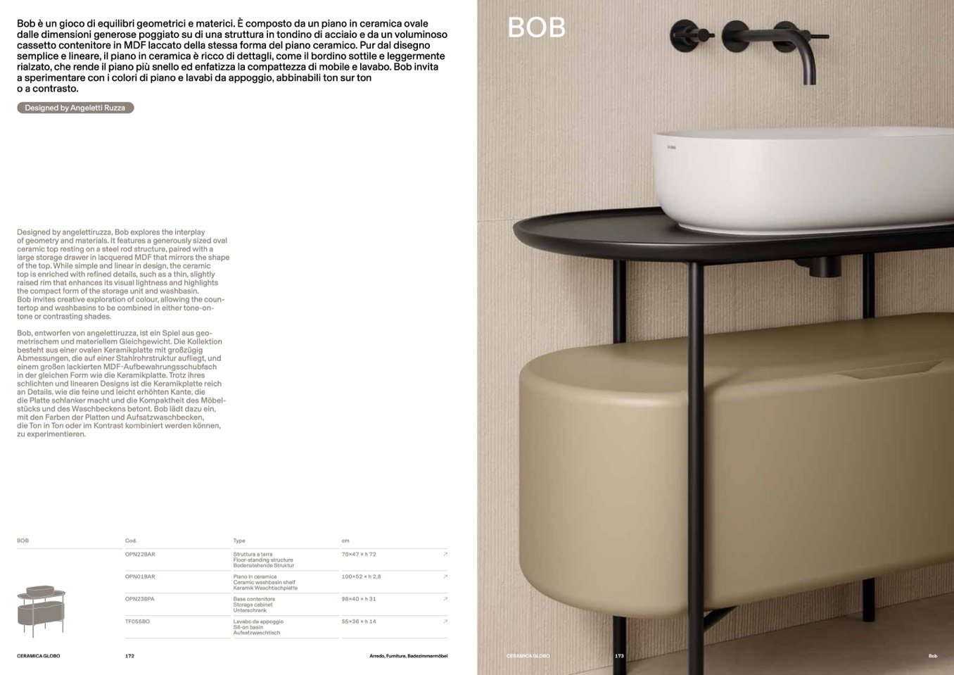 rialzato, che rende il piano più snello ed enfatizza la compattezza di mobile e lavabo. Bob invita