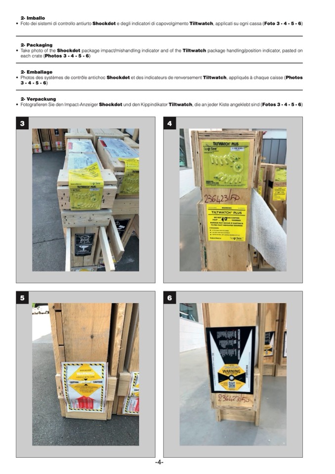 • Fotografieren Sie den Impact-Anzeiger Shockdot und den Kippindikator Tiltwatch, die an jeder Kiste angeklebt sind (Fotos 3 - 4 - 5 - 6)