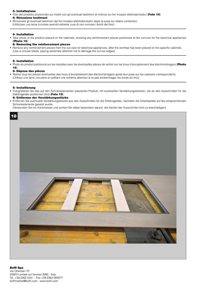 • Take photo of the product placed on the cabinets, showing any reinforcement pieces positioned at the cut-outs for the electrical appliances