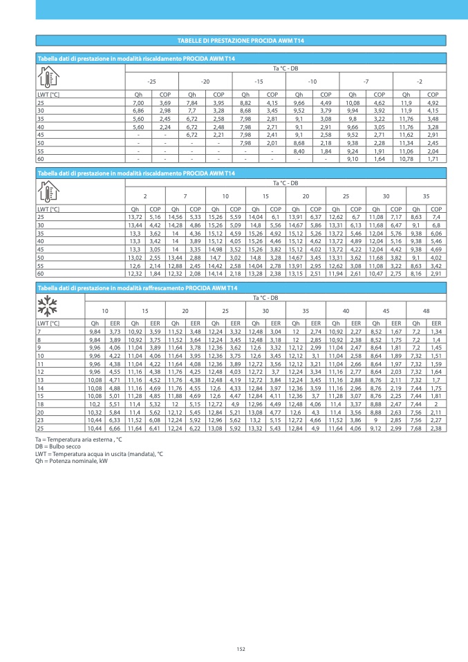 Tabella dati di prestazione in modalità riscaldamento PROCIDA AWM T14
