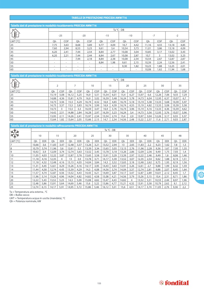 Tabella dati di prestazione in modalità riscaldamento PROCIDA AWM T16