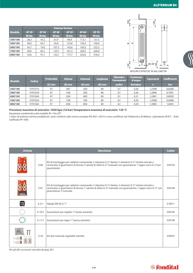 I valori di potenza termica pubblicati, sono conformi alla norma europea EN 442-1:2014 e sono certificati dal Politecnico di Milano, Laboratorio М.R.Т. - Ente