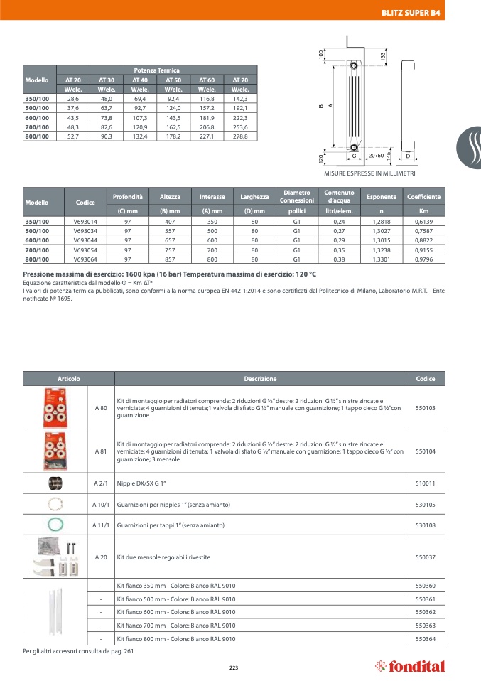 I valori di potenza termica pubblicati, sono conformi alla norma europea EN 442-1:2014 e sono certificati dal Politecnico di Milano, Laboratorio М.R.Т. - Ente
