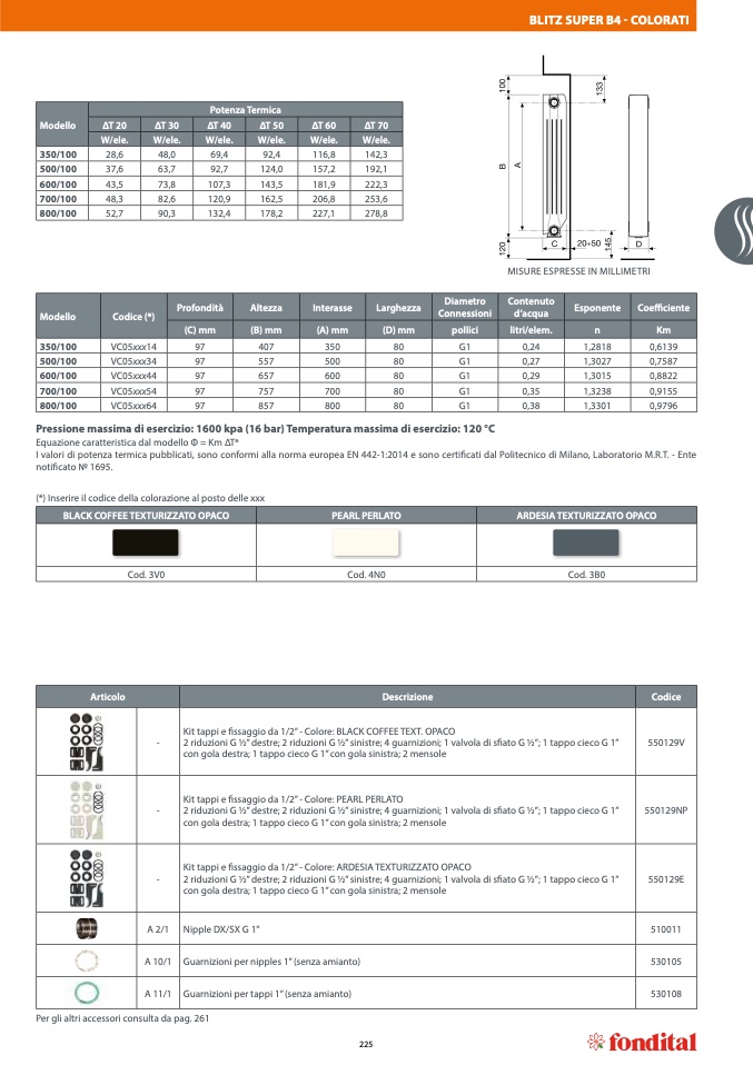 I valori di potenza termica pubblicati, sono conformi alla norma europea EN 442-1:2014 e sono certificati dal Politecnico di Milano, Laboratorio М.R.Т. - Ente