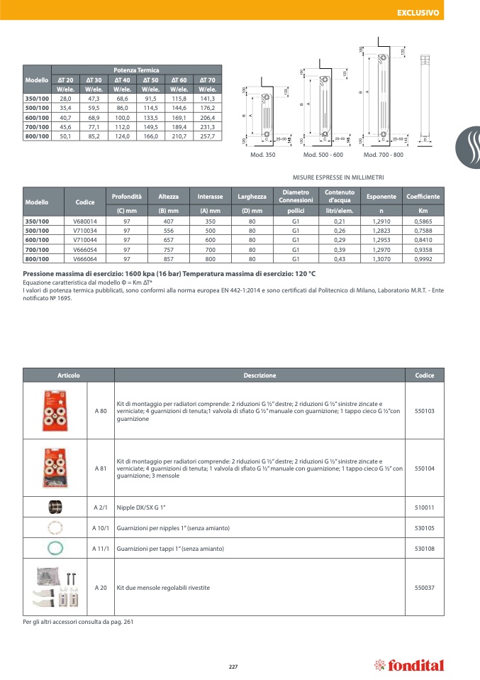 I valori di potenza termica pubblicati, sono conformi alla norma europea EN 442-1:2014 e sono certificati dal Politecnico di Milano, Laboratorio М.R.Т. - Ente