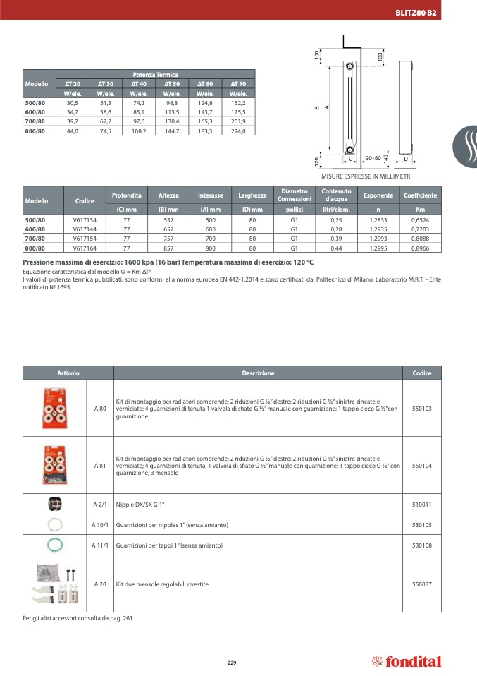I valori di potenza termica pubblicati, sono conformi alla norma europea EN 442-1:2014 e sono certificati dal Politecnico di Milano, Laboratorio М.R.Т. - Ente