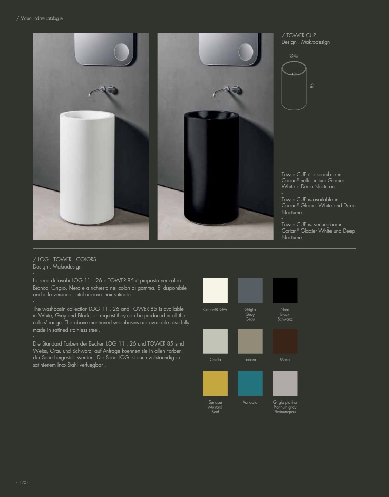 La serie di lavabi LOG 11 . 26 e TOWER 85 è proposta nei colori