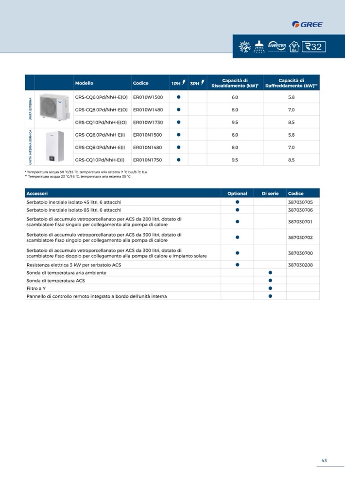 * Temperatura acqua 30 °C/35 °C, temperatura aria esterna 7 °C b.s./6 °C b.u.