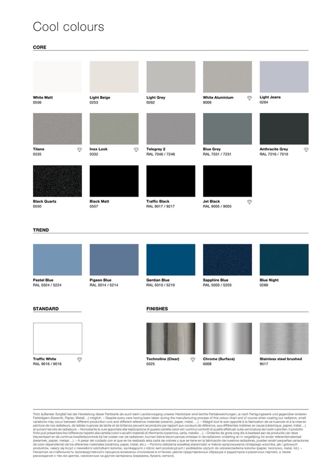 et suivant les lots de radiateurs. – Nonostante le cure apportate alla realizzazione di questa cartella colori ed i continui controlli di qualità effettuati sulla verniciatura dei nostri caloriferi, il prodotto