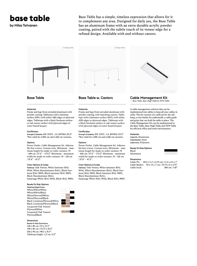 Frame/Legs: White (RAL 9016), Black (RAL 9005).