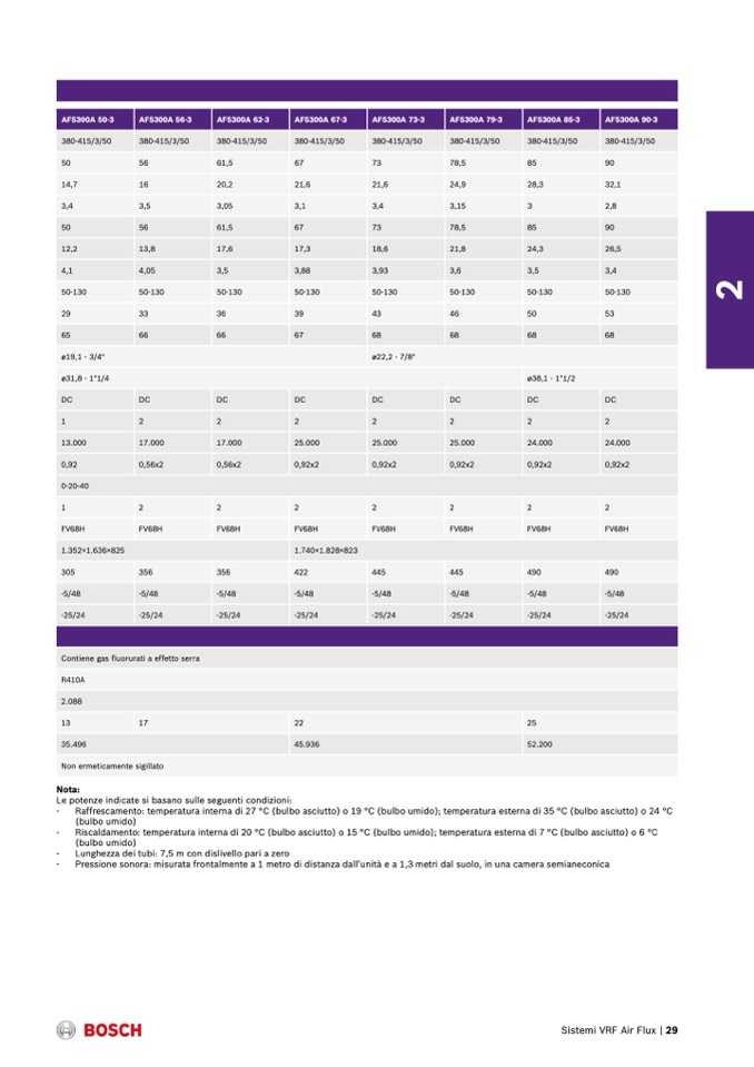 Raffrescamento: temperatura interna di 27 °C (bulbo asciutto) o 19 °C (bulbo umido); temperatura esterna di 35 °C (bulbo asciutto) o 24 °C