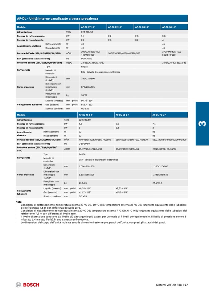 Condizioni di raffrescamento: temperatura interna 27 °C DB, 19 °C WB; temperatura esterna 35 °C DB; lunghezza equivalente delle tubazioni