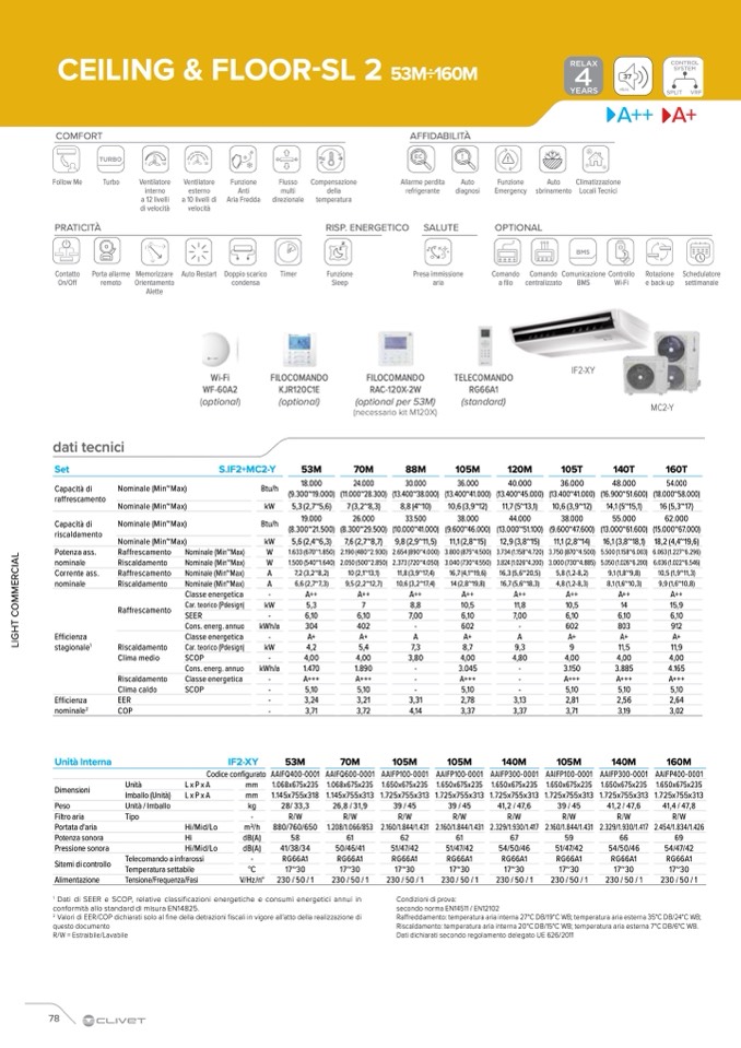 Riscaldamento: temperatura aria interna 20°C DB/15°C WB; temperatura aria esterna 7°C DB/6°C WB.