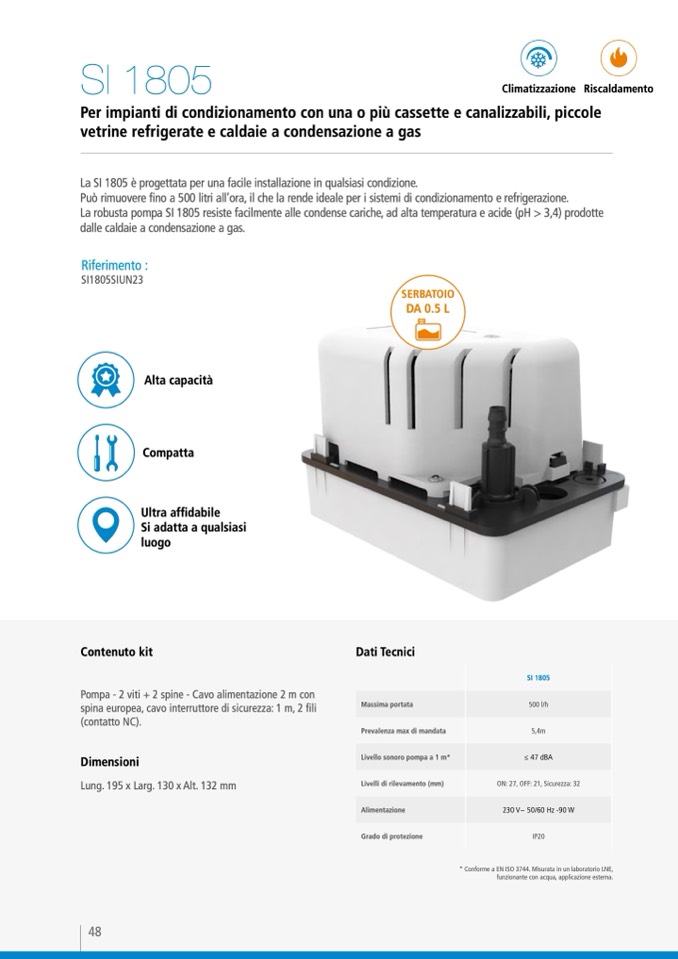 La robusta pompa SI 1805 resiste facilmente alle condense cariche, ad alta temperatura e acide (pH > 3,4) prodotte