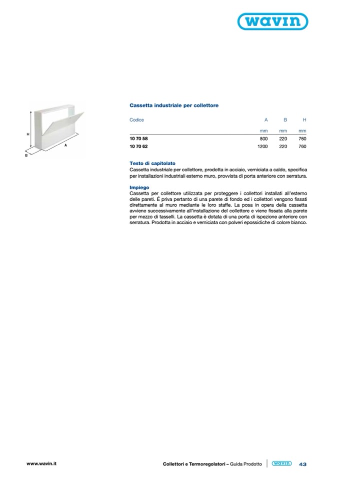 Cassetta industriale per collettore, prodotta in acciaio, verniciata a caldo, specifica