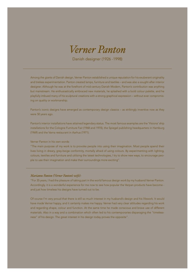 “For 35 years, I had the pleasure of taking part in the world famous design work by my husband Verner Panton.