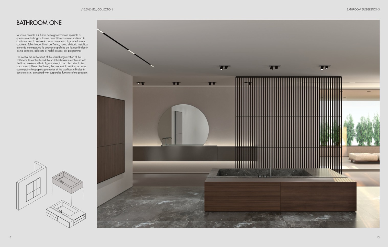 questa sala da bagno. La sua centralità e la massa scultorea in