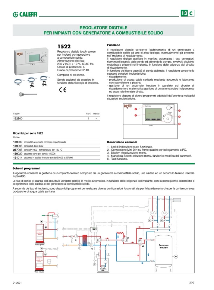 Il regolatore consente la gestione di un impianto termico composto da un generatore a combustibile solido, una caldaia ed un accumulo termico inerziale