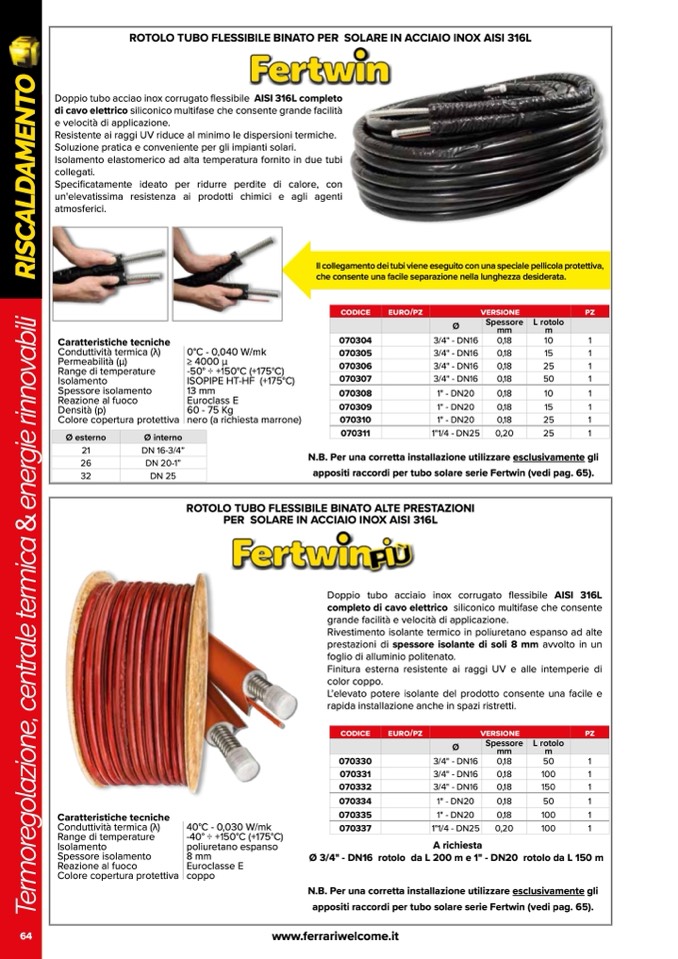 ROTOLO TUBO FLESSIBILE BINATO PER SOLARE IN ACCIAIO INOX AISI 316L