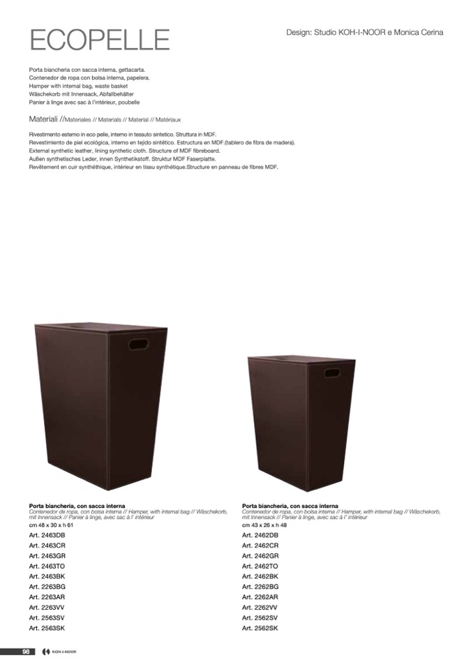 Rivestimento esterno in eco pelle, interno in tessuto sintetico. Struttura in MDF.