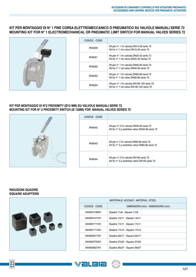 KIT PER MONTAGGIO DI N° 1 FINE CORSA ELETTROMECCANICO O PNEUMATICO SU VALVOLE MANUALI SERIE 72