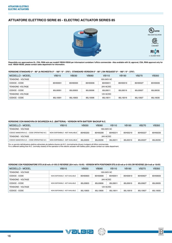 Disponibile con approvazione UL, CSA, RINA solo per modelli VB030-VB350 per informazioni contattare l’uf