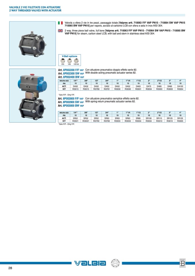 Art. 8P002200 F/F VAP Con attuatore pneumatico doppio effetto serie 82.