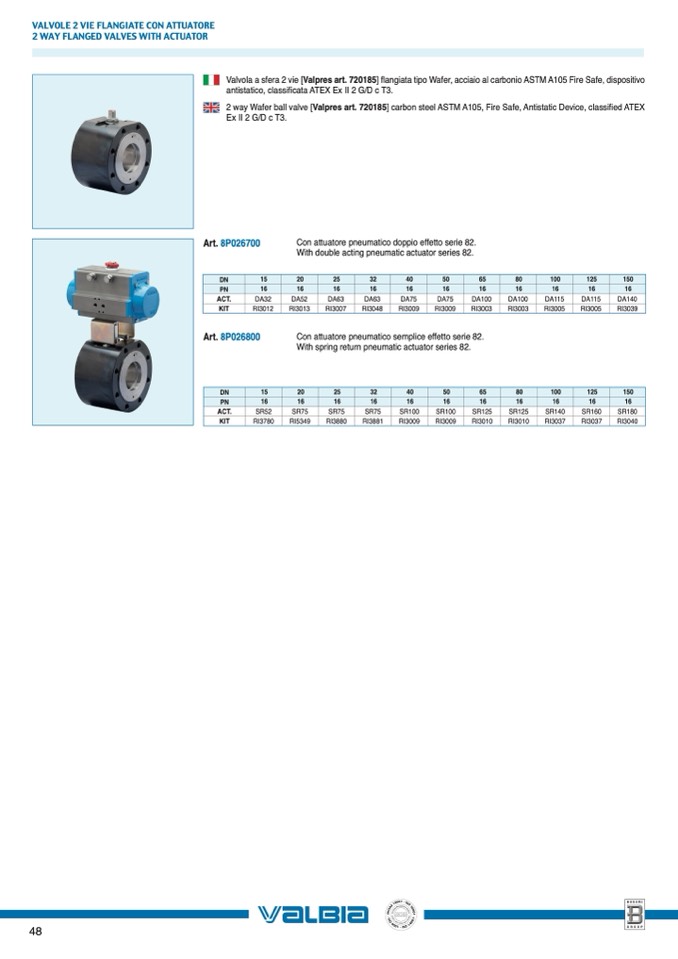 2 way Wafer ball valve [Valpres art. 720185] carbon steel ASTM A105, Fire Safe, Antistatic Device, classified ATEX