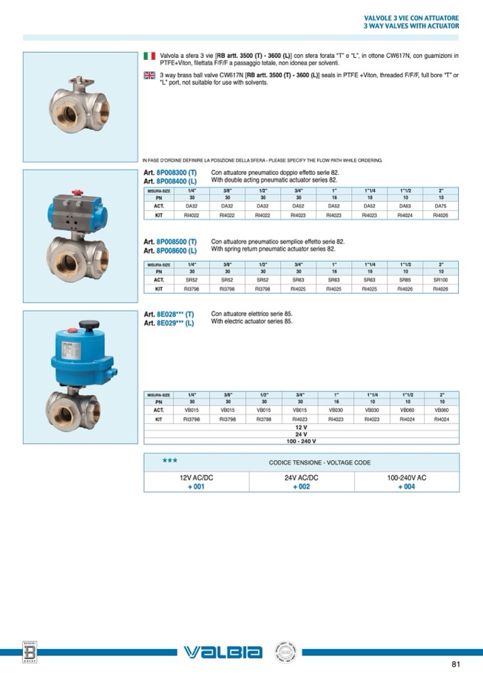 Valvola a sfera 3 vie [RB artt. 3500 (T) - 3600 (L)] con sfera forata “T” o “L”, in ottone CW617N, con guarnizioni in