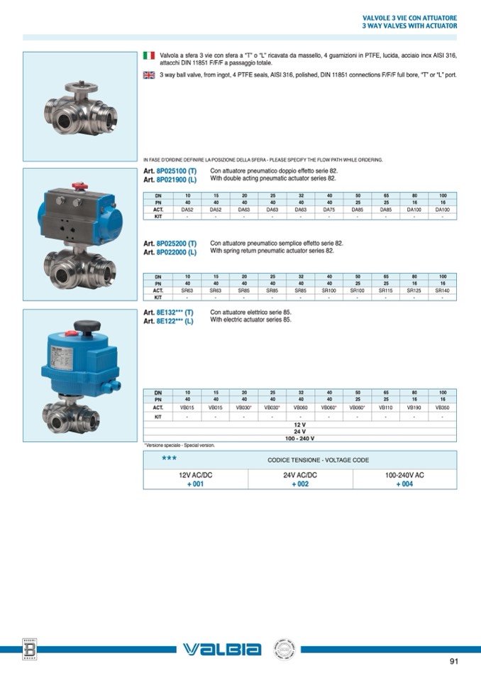 Valvola a sfera 3 vie con sfera a “T” o “L” ricavata da massello, 4 guarnizioni in PTFE, lucida, acciaio inox AISI 316,