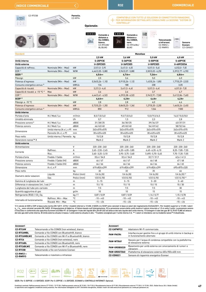 SEER: Per S-50PY3E + U-50PZ3E5. SCOP: Per S-25PY3E + U-25PZ3E5. ECONAVI e CONTROLLO INTERNET: Optional.