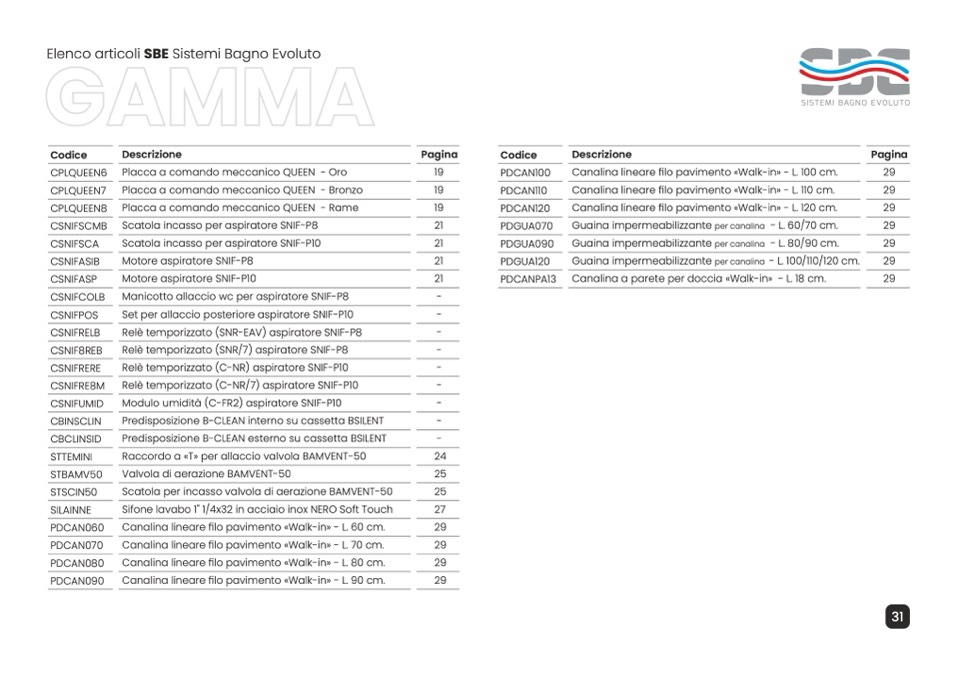 Elenco articoli SBE Sistemi Bagno Evoluto