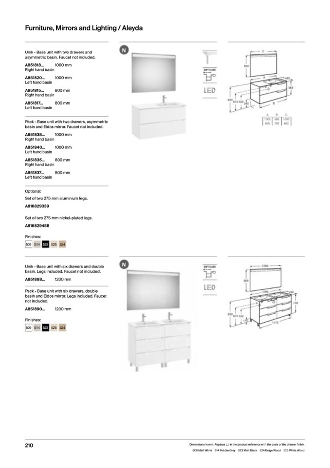 Dimensions in mm. Replace (...) in the product reference with the code of the chosen finish.