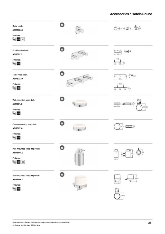 Dimensions in mm. Replace (..) in the product reference with the code of the chosen finish.