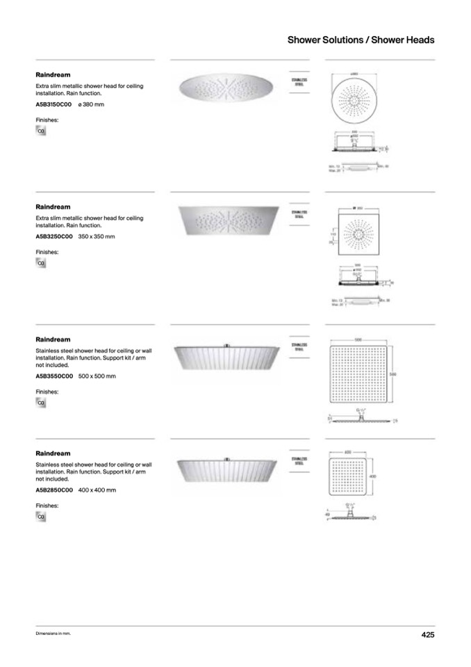 Stainless steel shower head for ceiling or wall