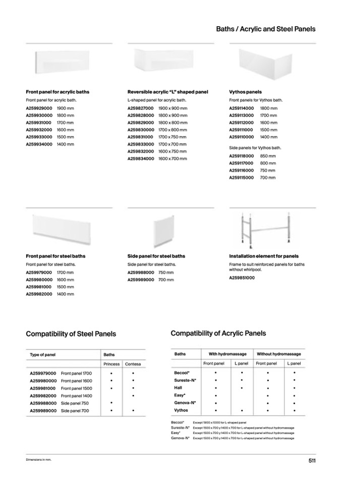 Except 1500 x 700 y 1400 x 700 for L-shaped panel without hydromassage