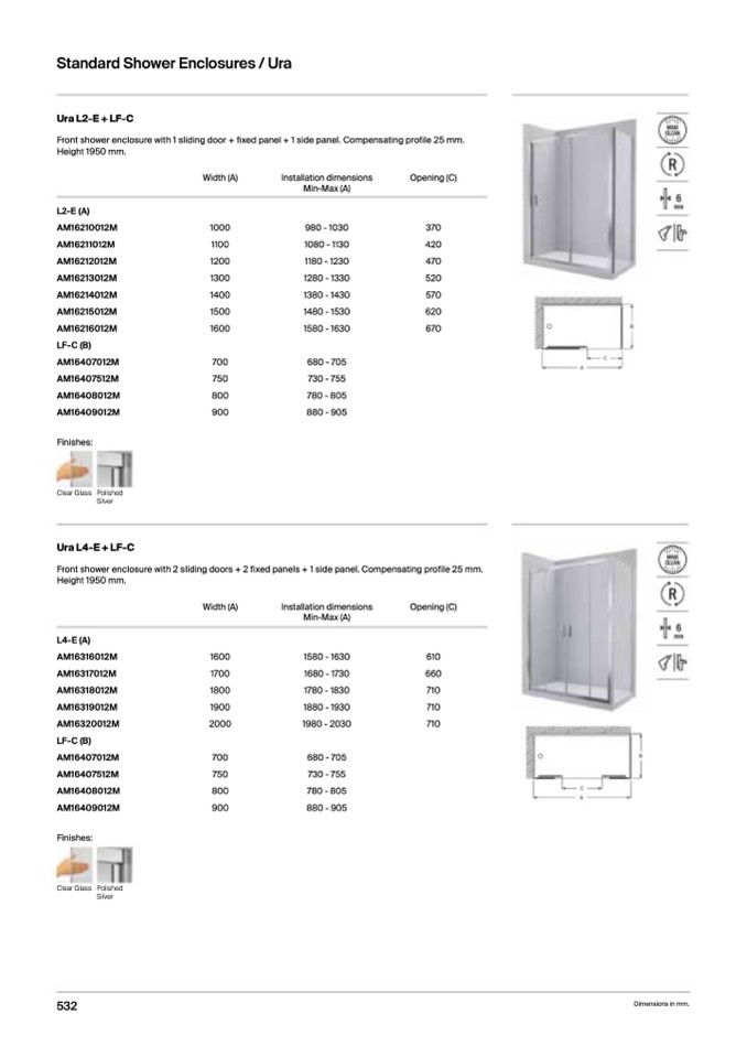 Front shower enclosure with 2 sliding doors + 2 fixed panels + 1 side panel. Compensating profile 25 mm.
