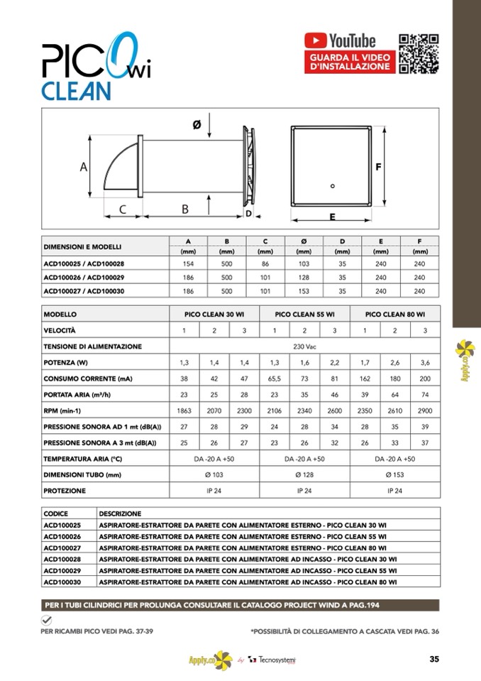 ASPIRATORE-ESTRATTORE DA PARETE CON ALIMENTATORE AD INCASSO - PICO CLEAN 80 WI