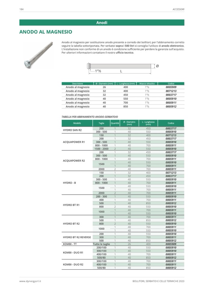 seguire la tabella sottoriportata. Per serbatoi sopra i 500 litri si consiglia l'utilizzo di anodo elettronico.