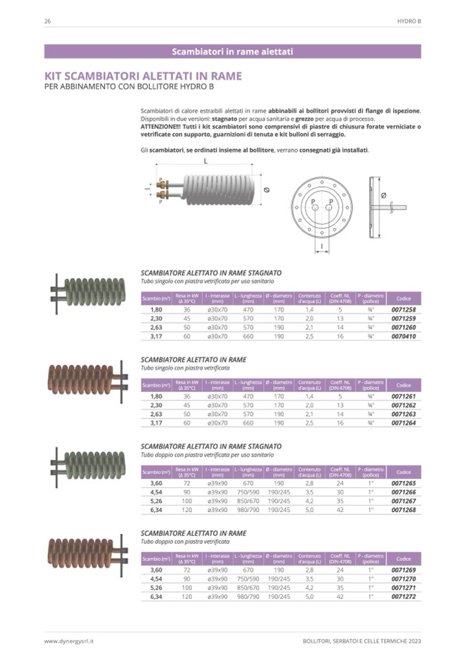 Scambiatori di calore estraibili alettati in rame abbinabili ai bollitori provvisti di flange di ispezione.
