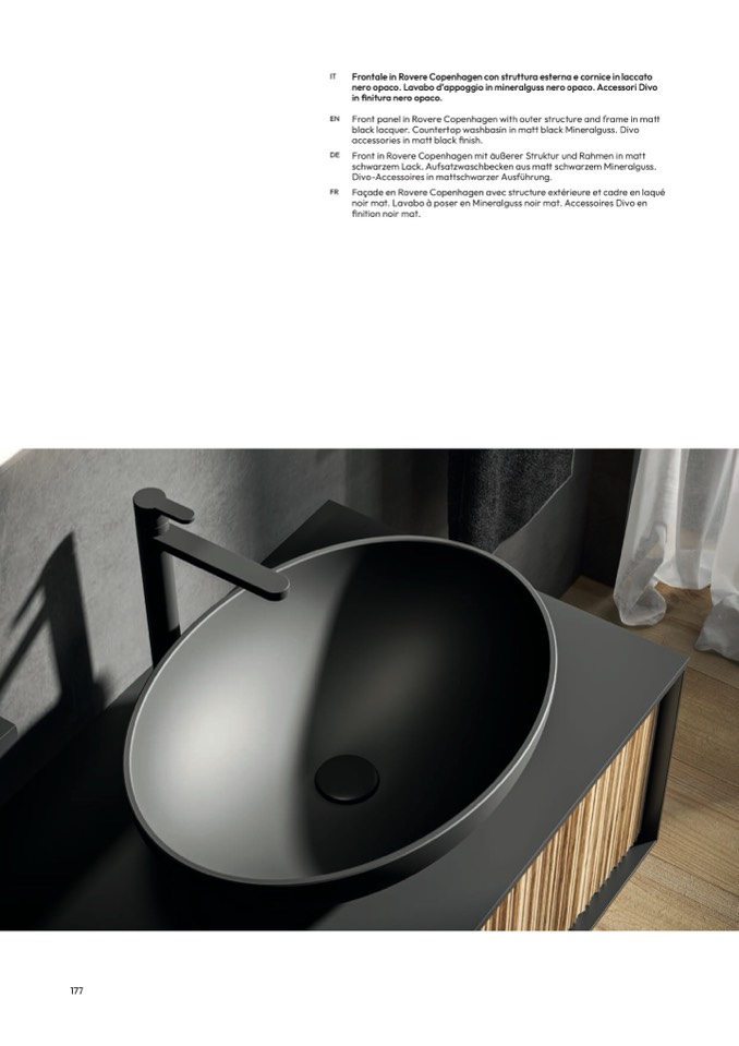 black lacquer. Countertop washbasin in matt black Mineralguss. Divo