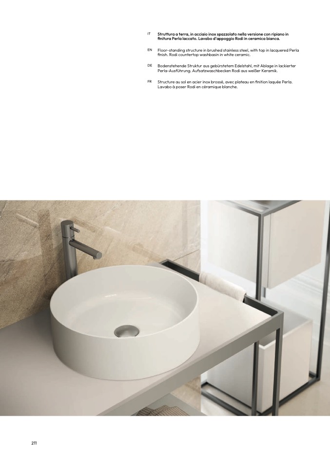 finitura Perla laccato. Lavabo d’appoggio Rodi in ceramica bianca.