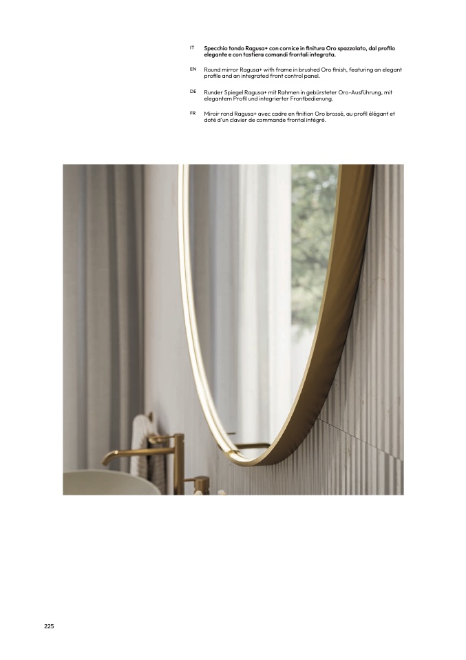 Round mirror Ragusa+ with frame in brushed Oro finish, featuring an elegan