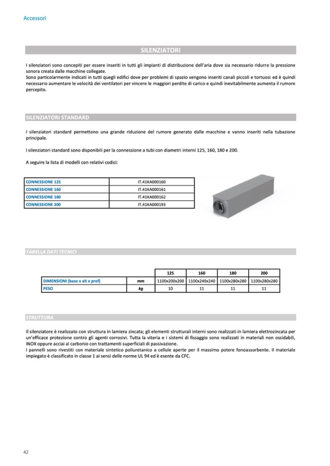 Il silenziatore è realizzato con struttura in lamiera zincata; gli elementi strutturali interni sono realizzati in lamiera elettrozincata per
