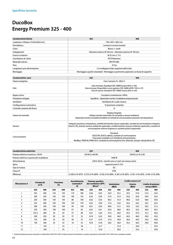 * Livello di potenza sonora misurato in conformità a ISO 3741: 2010. Livello sonoro di immissione e scarico secondo la norma ISO 5135: 1997 (con correzione canale)