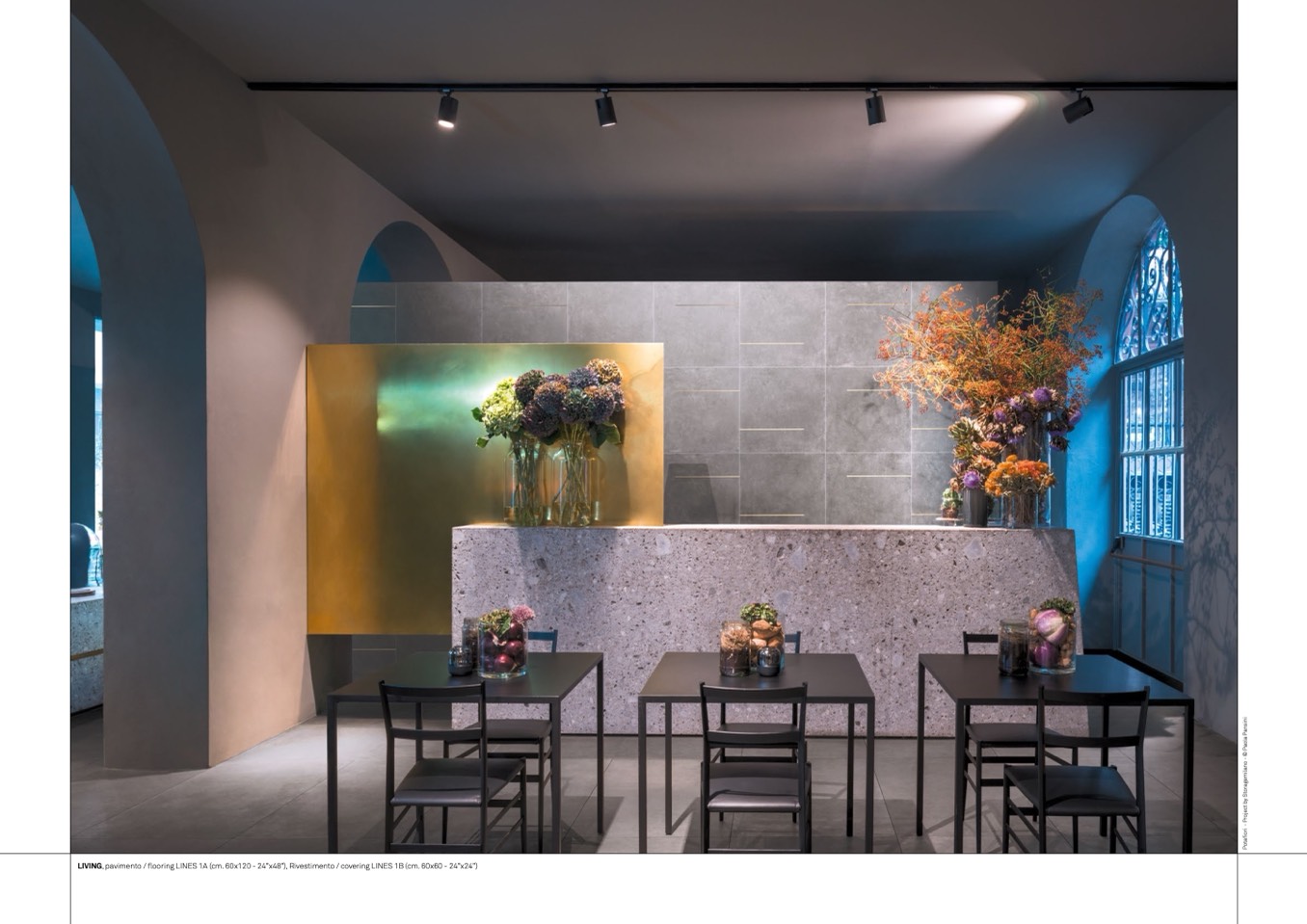 LIVING, pavimento / flooring LINES 1A (cm. 60x120 - 24”x48”), Rivestimento / covering LINES 1B (cm. 60x60 - 24”x24”)